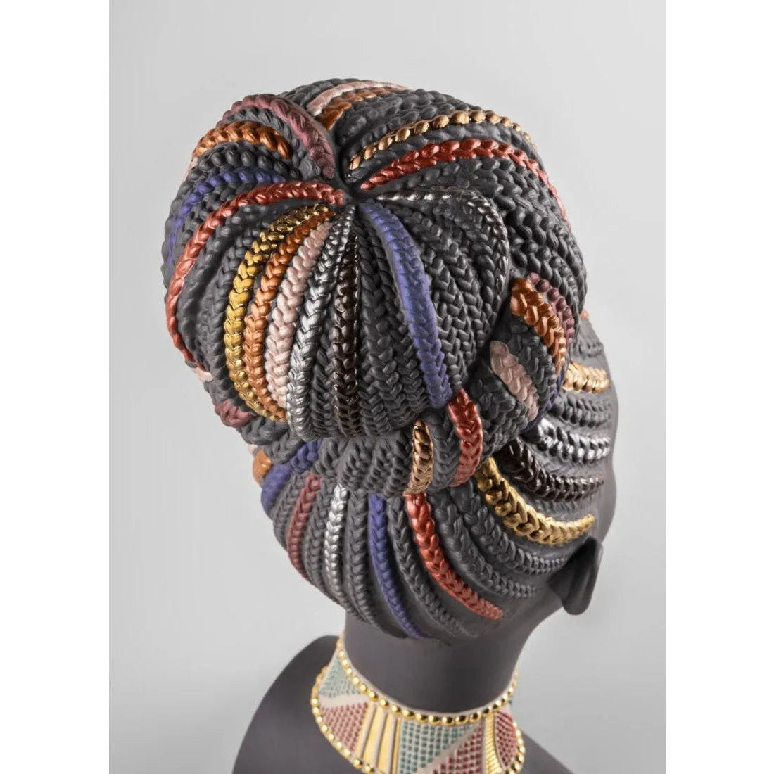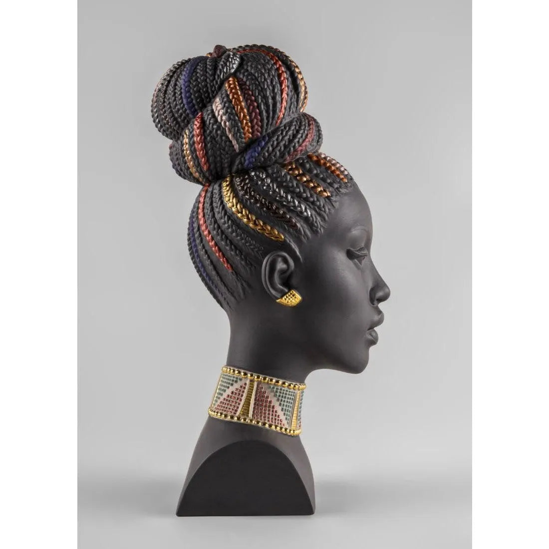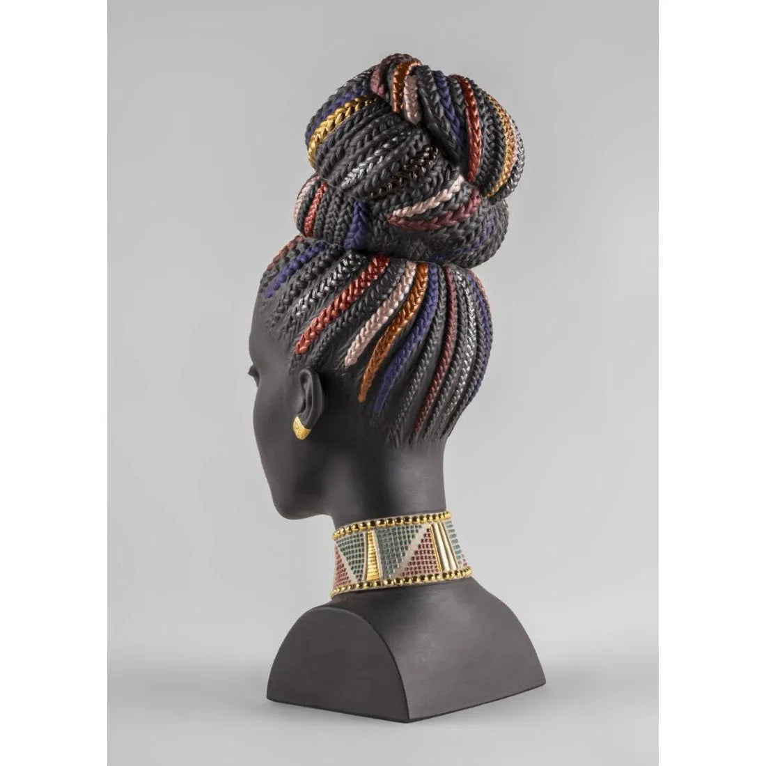 Made in matte black porcelain, this bust of a woman borrows its inspiration from the symbolism and intense coloring of African culture. The serene facial features, masterfully sculpted, are rounded off with a decoration using luster and metallic colors. Particularly noteworthy are the details etched in the earrings and pendant and the ornamental work recreating the intricate braiding of the hair. The result is a creation with great expressive strength that speaks to the character of African art.
