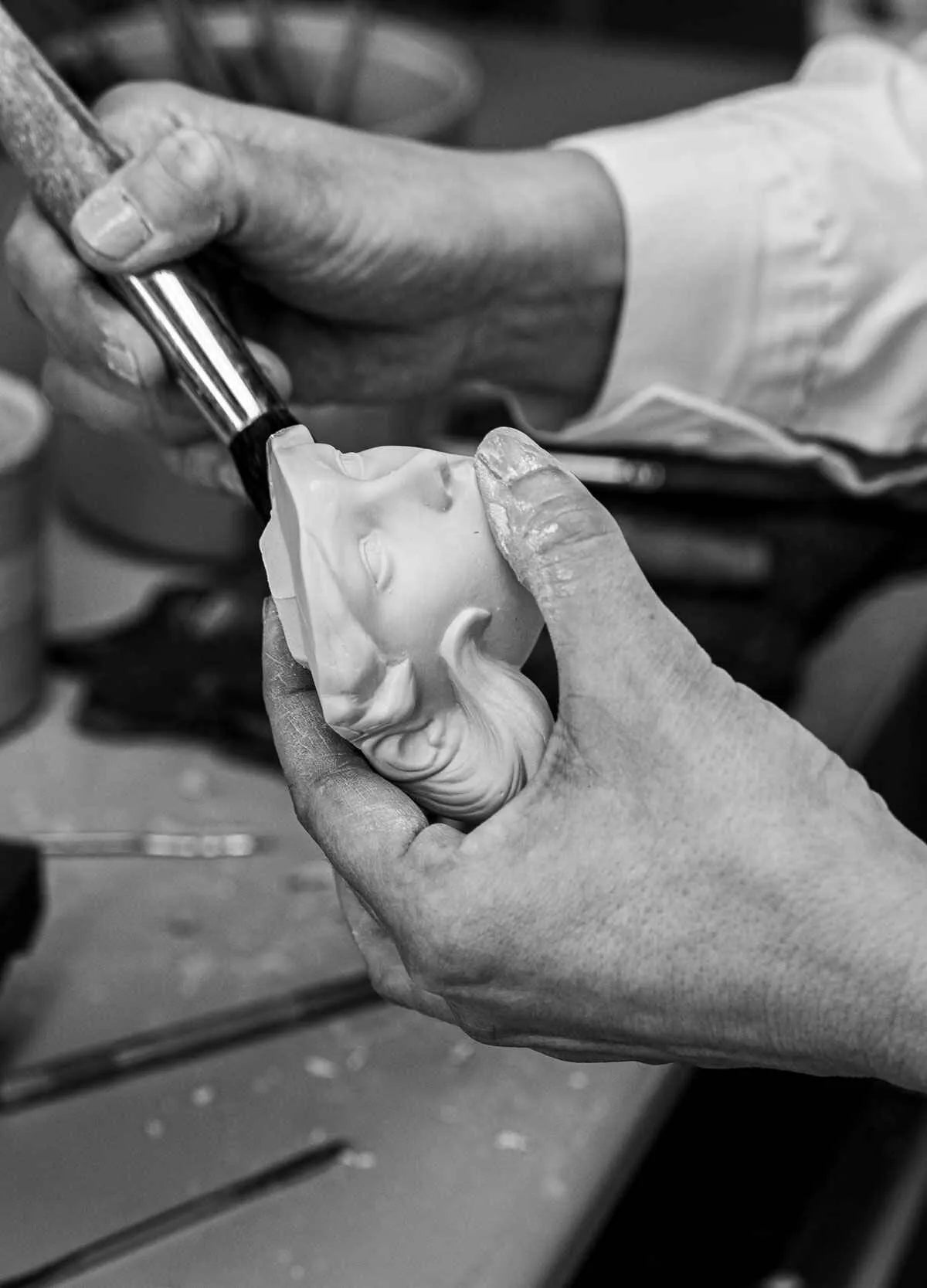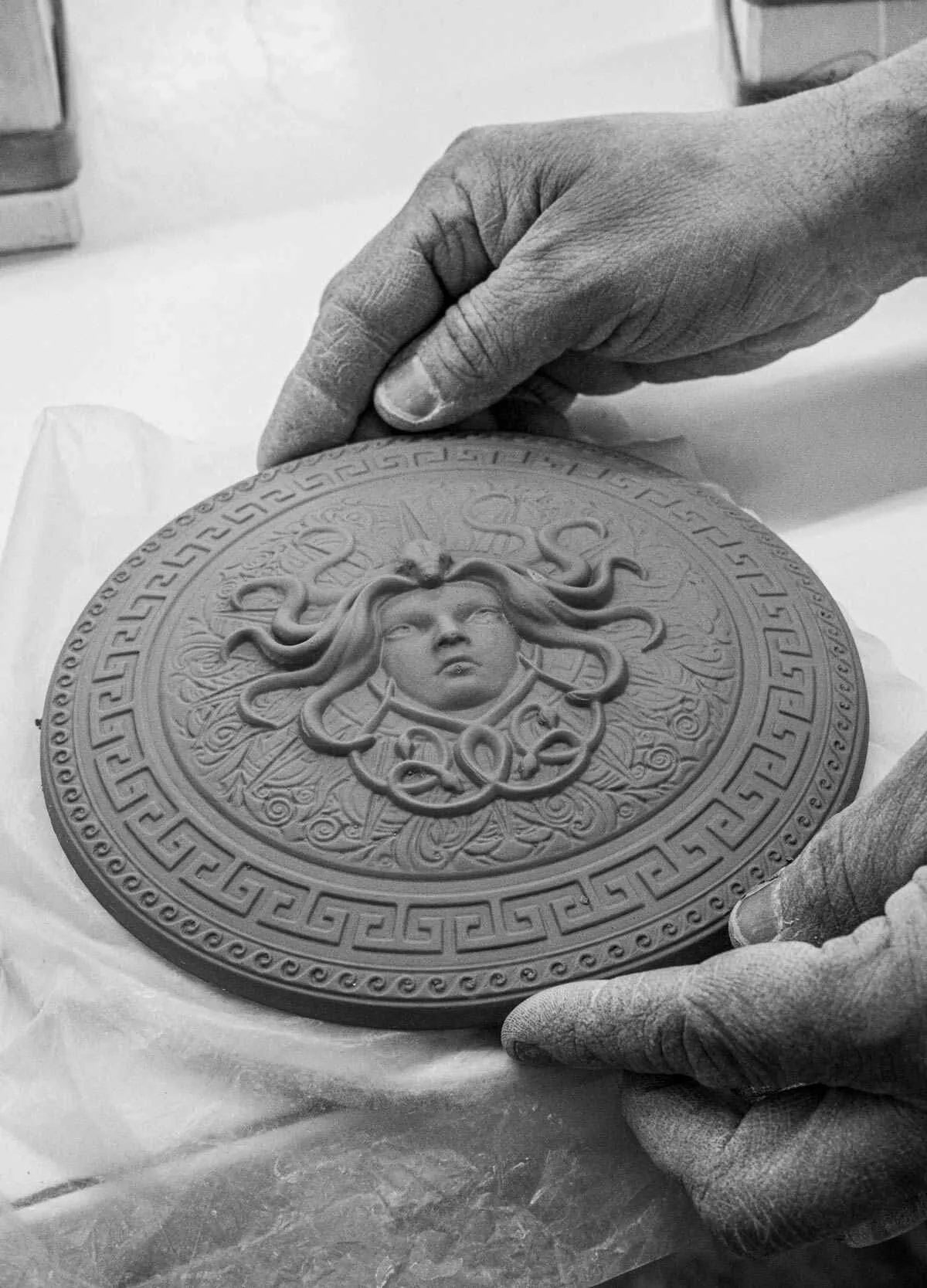 The daughter of Zeus and Metis, Athena was the Greek goddess of wisdom, tactics and good counsel. Believed to be the protectress of the city of Athens, she is also the goddess of war, understood as the fight to achieve justice. Greek mythology, with its legends, gods and heroes, continues to captivate us today. The wealth of its stories and its powerful symbolism are an endless source of inspiration for our artists. Athena comes to life in our workshops thanks to this interpretation in white matte porcelain, decorated with ocher and golden lusters and with metallic whites in an iridescent finish. Accompanying the goddess is her faithful owl, the symbol of wisdom. This bird is portrayed in porcelain in great detail, posing on Athena’s shoulder and also etched in bas relief on the helmet, bracelet and leg guards. In addition, etched on the protective shield is the head of Medusa, the gorgon who turned anyone who looked upon it into stone. Gods depicted through other gods, characters that converge and lives that intersect in order to share with us the culture of Ancient Greece and its fascinating history.