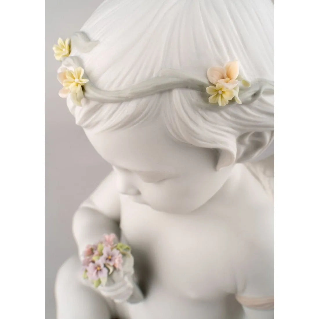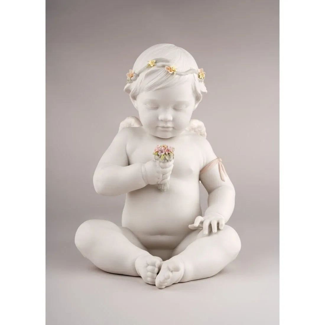 Angels have a leading place among Lladró creations. The combination of their symbolism, commonly associated with a protective role, and their image, at times ethereal and other times sweet and lovable, make for a very ready connection. This creation, which contain 24 flowers, 14 in the crown and 10 in the bouquet, are handmade petal by petal.