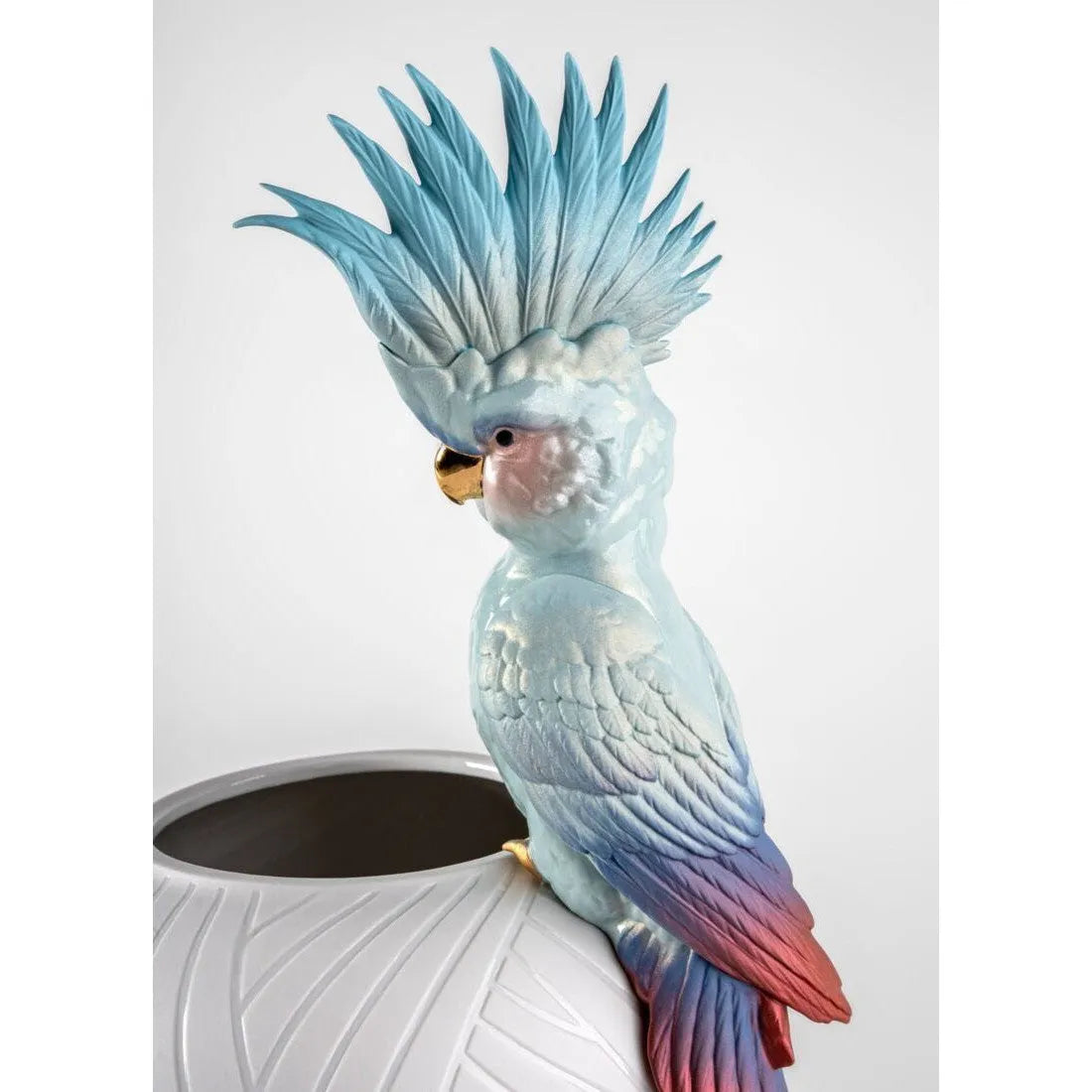 In this porcelain interpretation the cockatoo is decorated in a range of mainly bluish and reddish colors applied in degraded tones. These colors are complemented with the iridescent crystal of the head and body and the touches of golden luster, in both matte and glazed, on the legs and beak. All the decoration is applied in fine brushstrokes to achieve a nuanced chromatic effect.