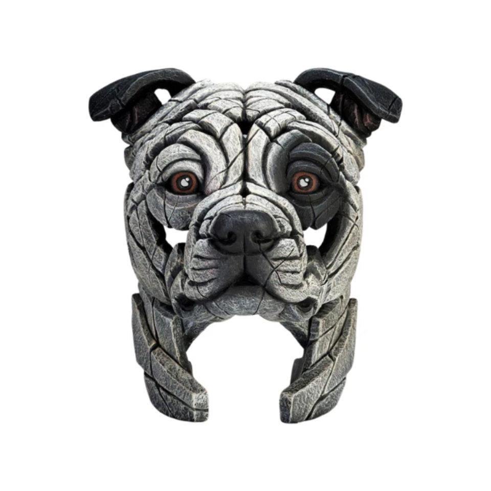 | Staffordshire Bull Terrier bust by Matt Buckley - from the EDGE contemporary sculpture collection. Originally bred in the 19th century as a fighting dog, the Staffordshire Bull Terrier is these days very much a family pet and show dog. The Staffy's active, friendly, intelligent and cheeky nature has made them a big hit with owners. Matt Buckley's superb sculpture has caught the spirit of this popular dog perfectly. This sculpture is finished with white tones and a black eye patch. With over 40 years of experience, Gallery Gifts is the UK’s leading name in gifts and collectables. Whatever the occasion, our aim is to ensure you find the perfect gift. Browse our online shop or visit one of our stores for our newest items and exclusives. H:28.5cm W:27cm D:22.5cm |