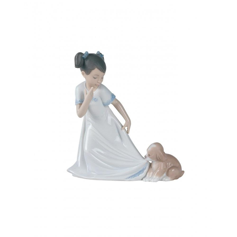 Nao Porcelain Figurine "Let Me Go!" sculpted by Rafael Lozano in 2002. Porcelain figurine of a young girl playing catch with her puppy. This beautiful and elegant porcelain figurine is a timeless classic from the Nao by Lladro collection.