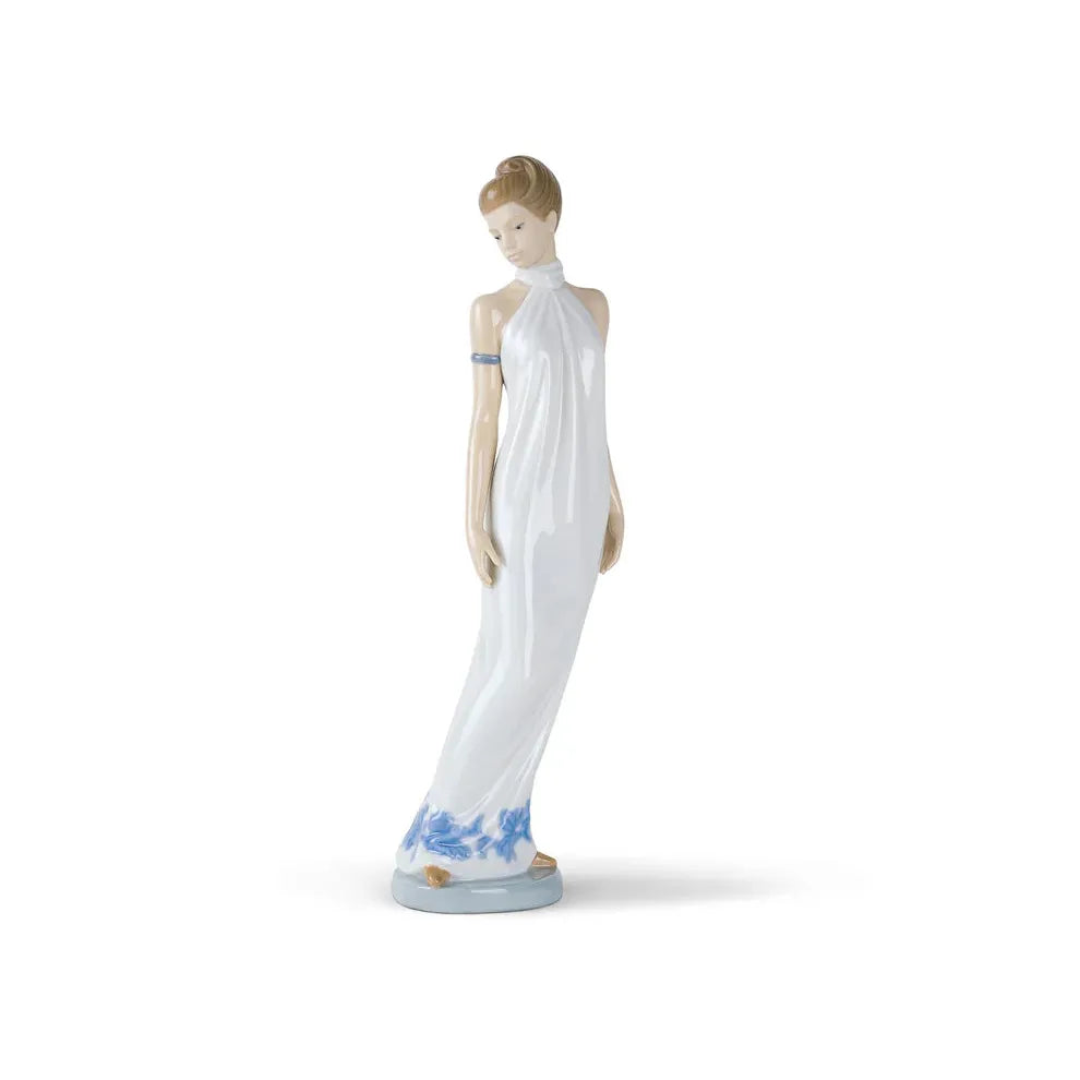 A stunning figurine of a woman in a flowing white evening dress with a blue base motif. The detail in the hair and dress of this figure, combined with the graceful pose portrayed, help this piece to truly live up to its name and make it a gorgeous gift to give to an important lady in your life.