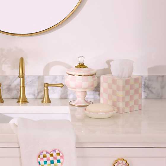 For housing treasured trinkets, there’s no container more charming than our Rosy Check® Curiosity Pot. The handsome curved pot with a perfectly matched pedestal is dressed in our checks hand-painted in a range of rosy hues and topped off with a lid featuring a clear glass knob.
