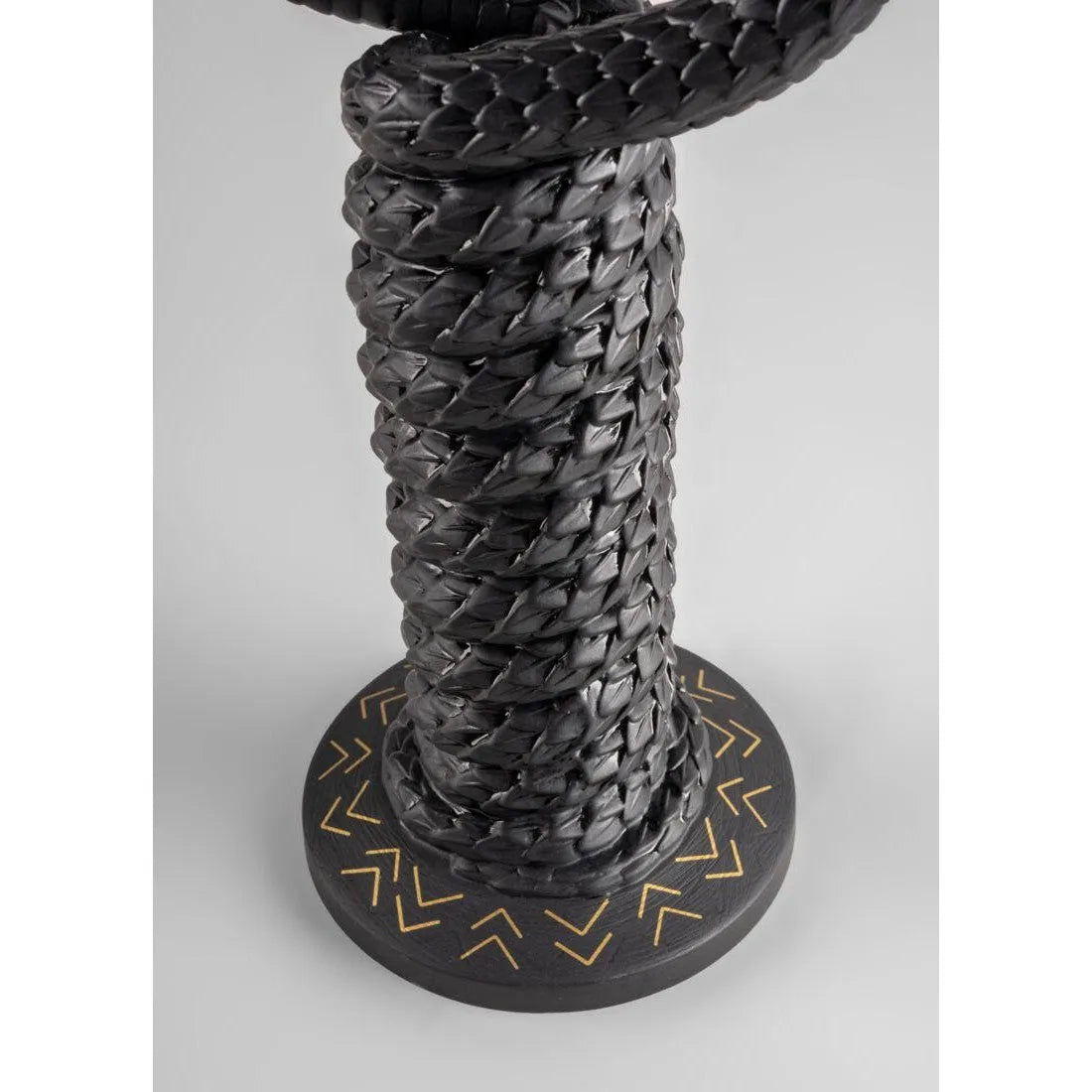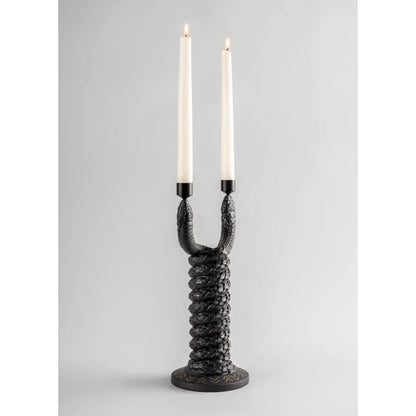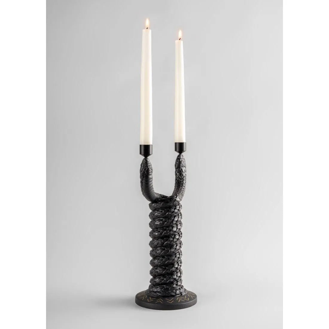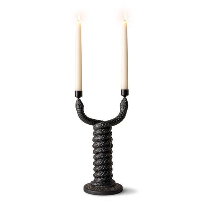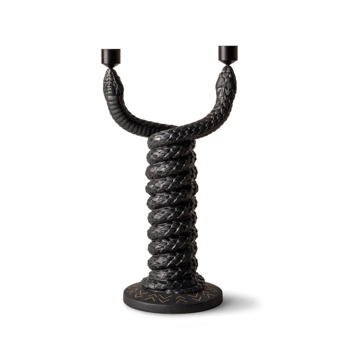 Matte black porcelain candleholder from the Snakes collection. The snake is a fascinating creature that arouses imagination, fear and curiosity in humans. According to different cultures, it is an ancestral symbol of the life cycle, of wisdom and knowledge, spirituality or power and protection. The design of this piece is based on the movement suggested by the intertwining bodies of the two snakes and the evocative texture of their skin, faithfully reproduced in the minutely detailed modelling. The candleholder does not come with candles