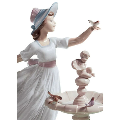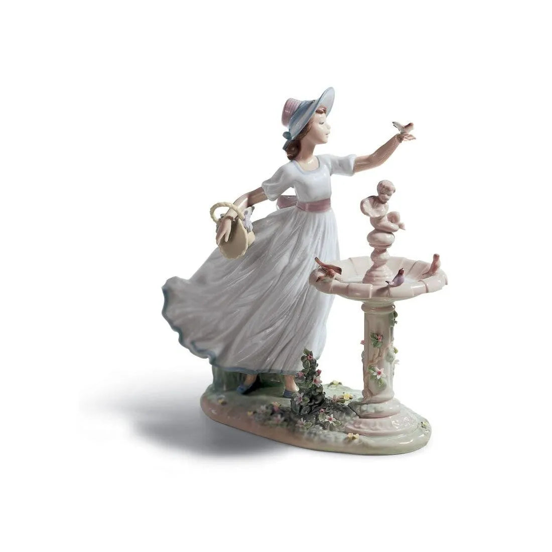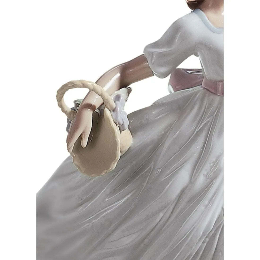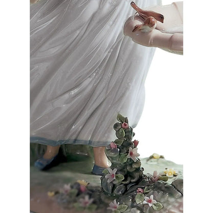 The scent of the flowers, the soft breeze of spring, the birds singing... This charming young woman transports us to just such a romantic and idyllic place. A glossy porcelain piece, finished in pastel colours, ideal as a gift, collectible or decoration.